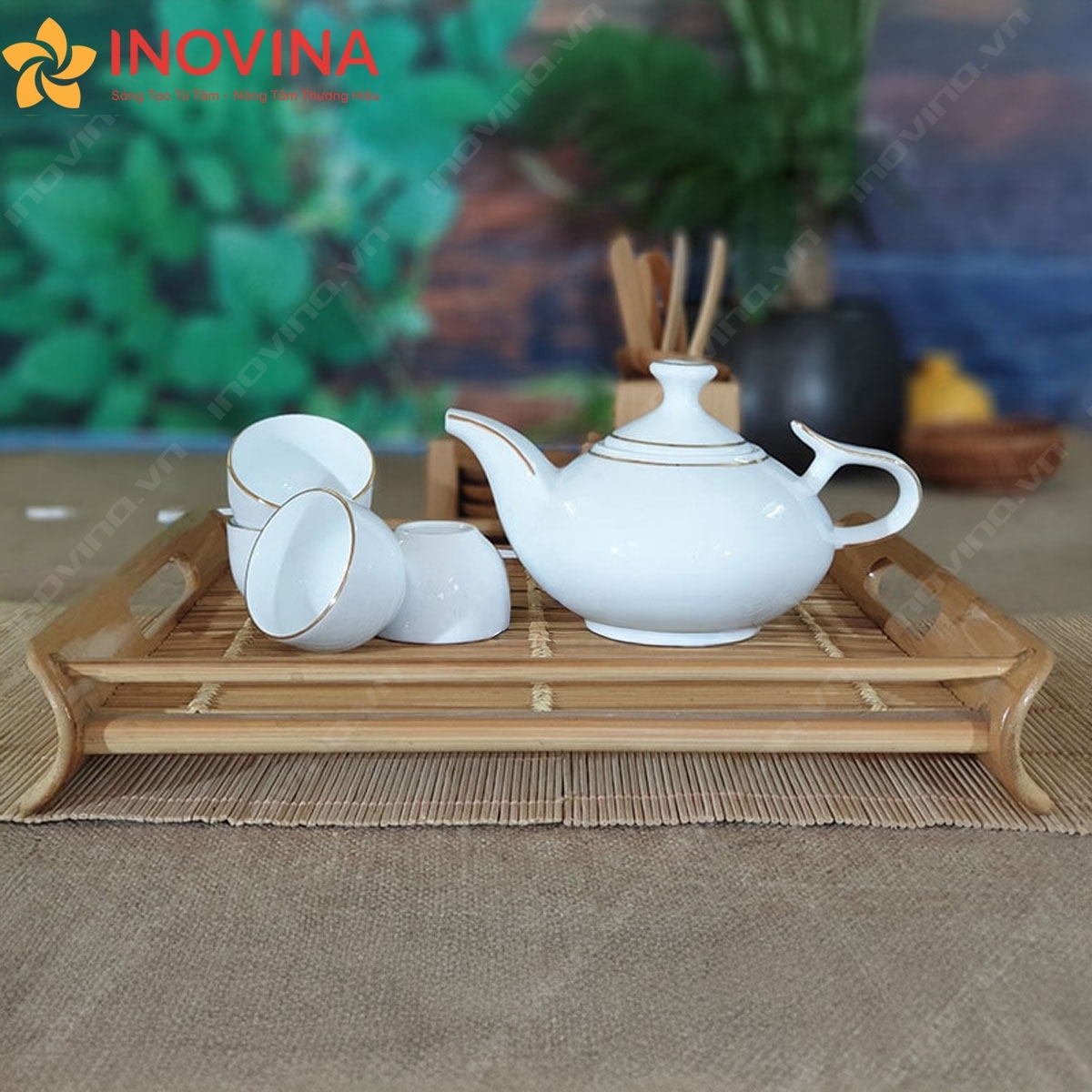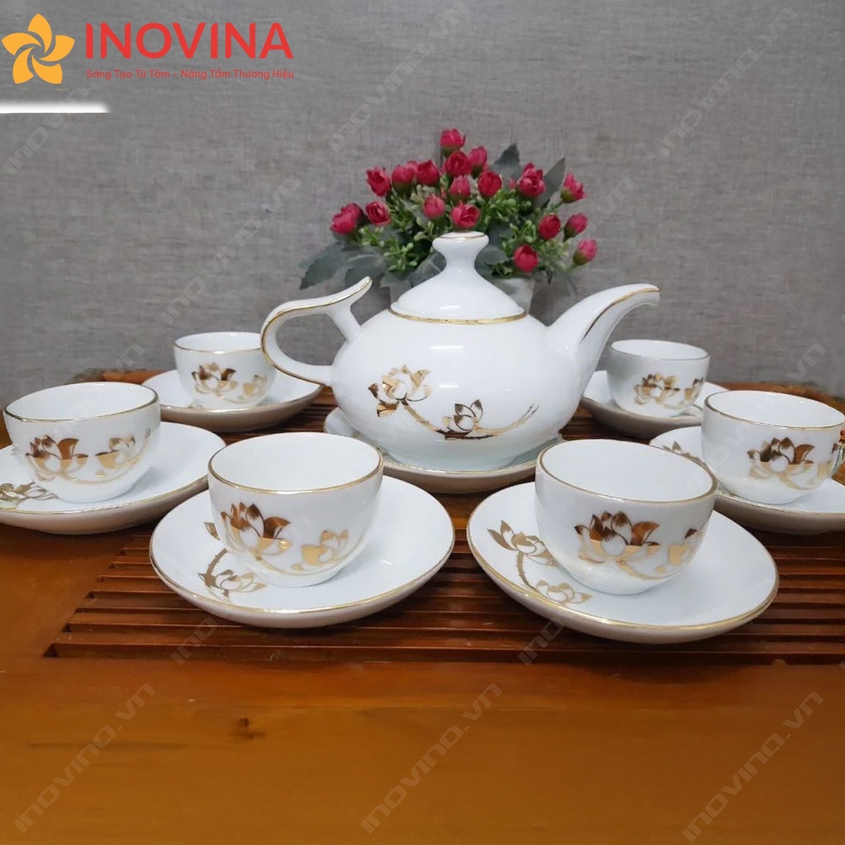 Bộ ấm trà Bát Tràng Dáng Đèn Thần Sen Vàng In Logo Quà Tặng