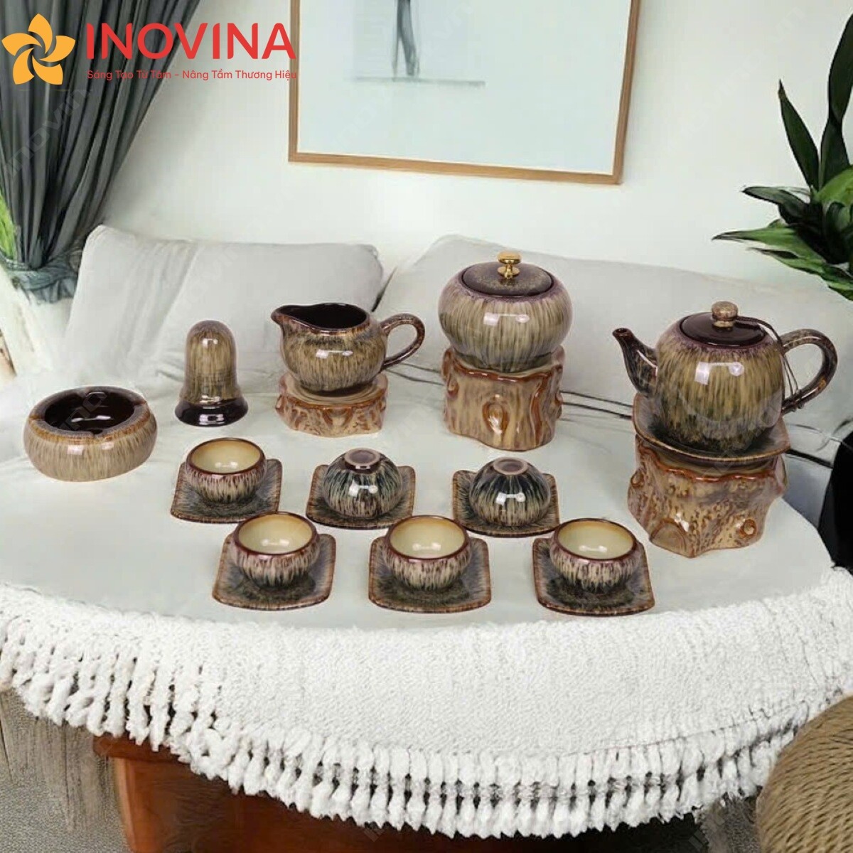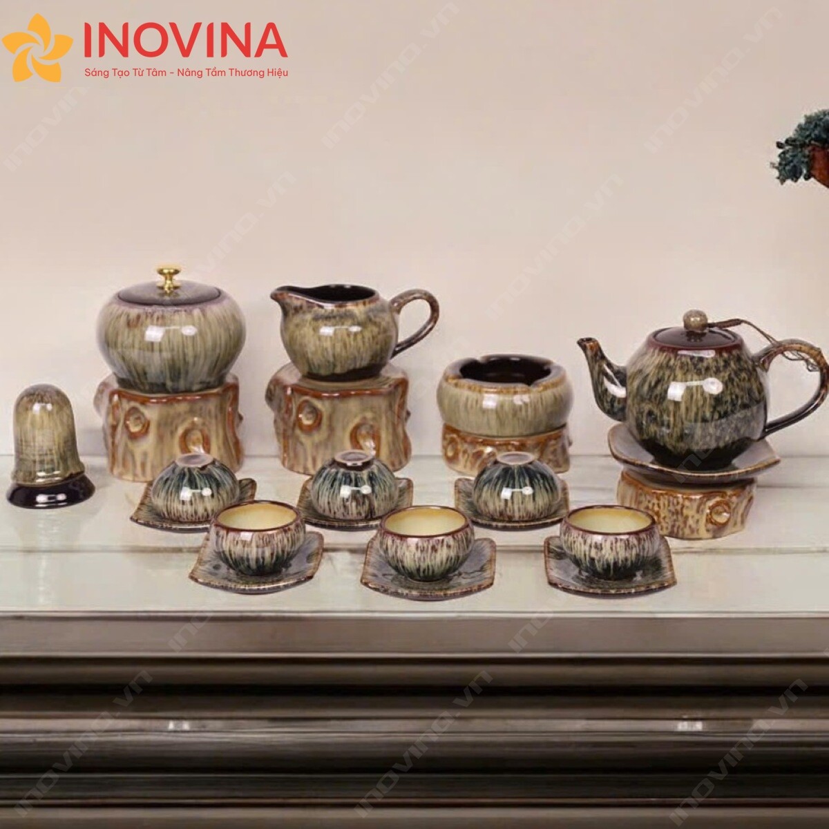 Bộ Ấm Trà Bát Tràng Dáng Dừa Men Hỏa Biến Quà Tặng DN