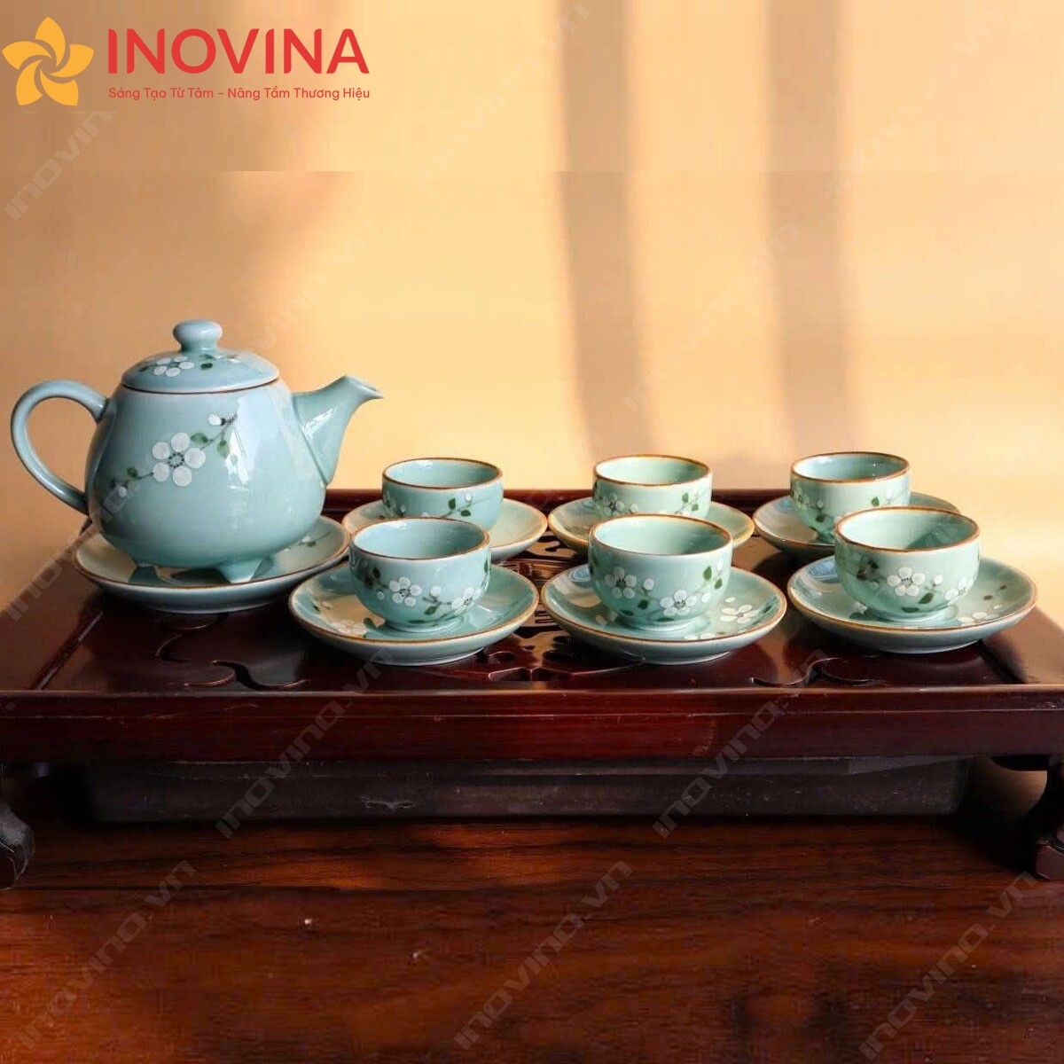 Bộ Ấm Trà Bát Tràng Dáng Mới 3 Chân Hoa Tuyết In Logo