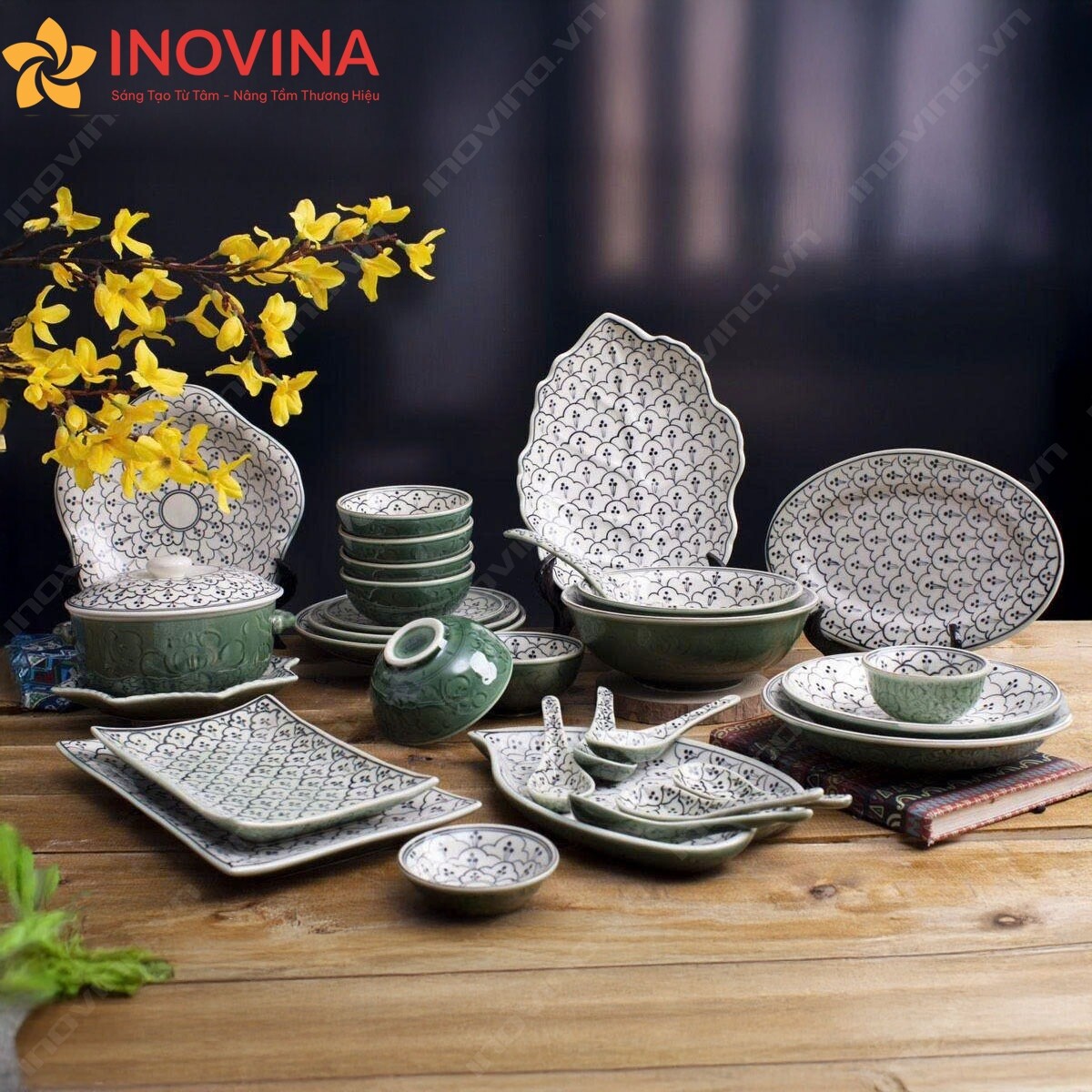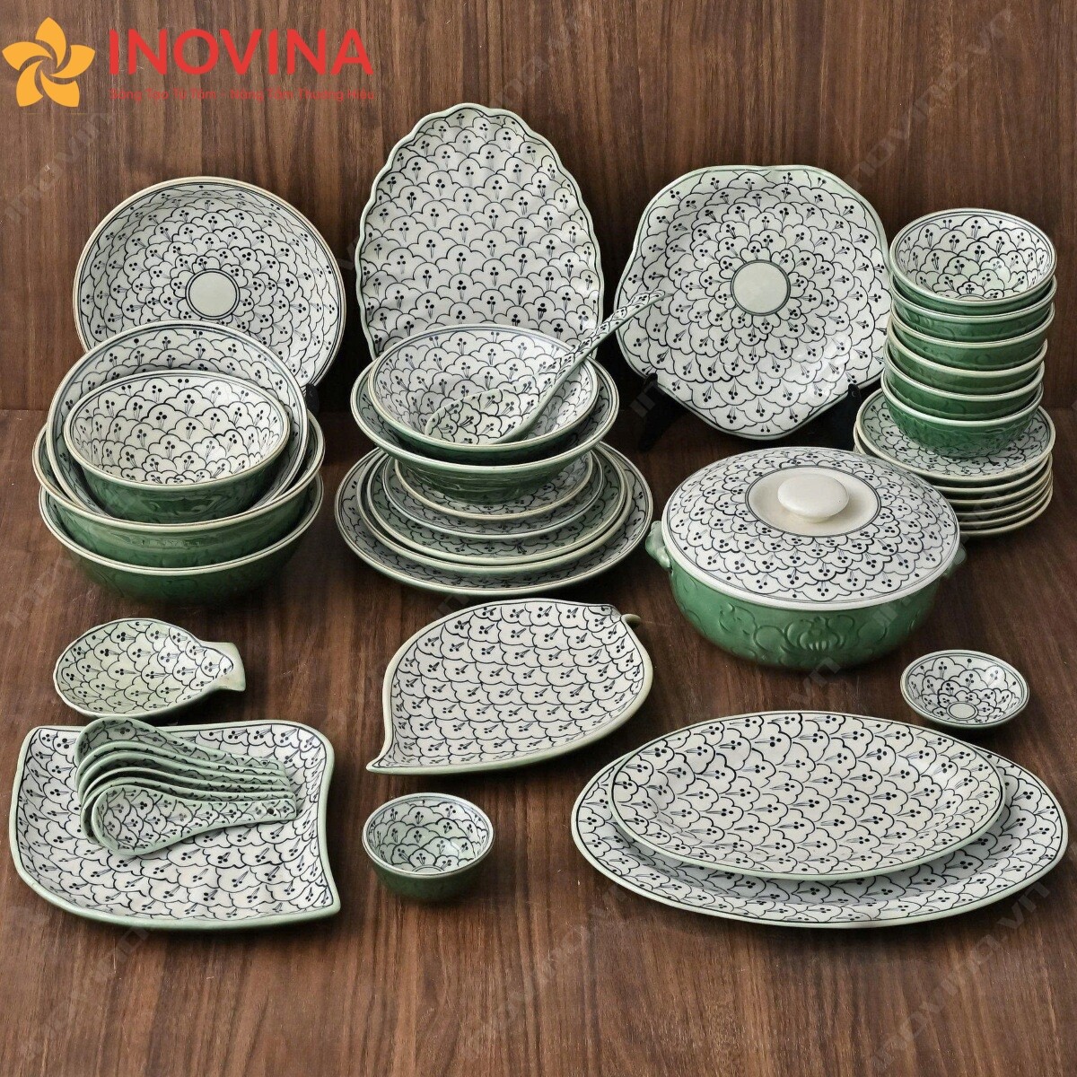 Bộ Bát Đĩa Men Lục Khắc Nổi Hoa Sen In Logo Giảm 20%