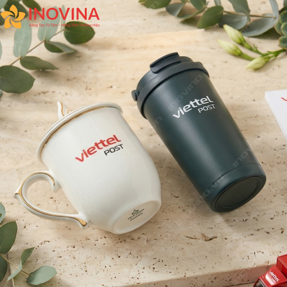 Set Quà Tặng Ly Giữ Nhiệt Và Ly Sứ Có Nắp In Logo Mới